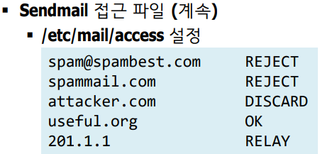 - RELAY: relay를 허용, 다른 규칙이 거부하는 경우에도 지정된 특정 도메인에 있는 사용자에게 오는 메일을 받음